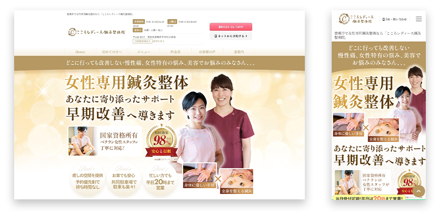 屋号名 こころレディース鍼灸整体院 HP https://toyohashi-sinkyu-seitai.com/ ターゲット 30代以降の女性 カラー ゴールド、ベージュ プラン フルカスタマイズ 参照の... -