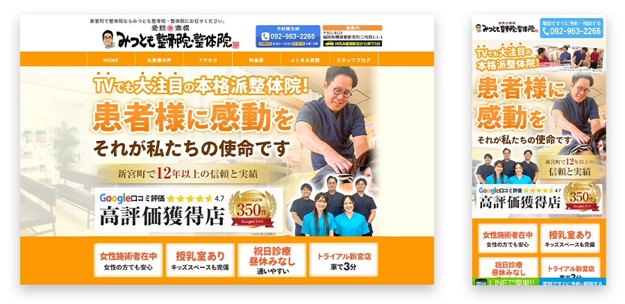 屋号名 みつとも整骨院・整体院 HP https://mitsutomoseikotsuin.com/ ターゲット 幅広い世代の男女 カラー オレンジ プラン フルカスタマイズ 参照の同意 必要 デザイ... -