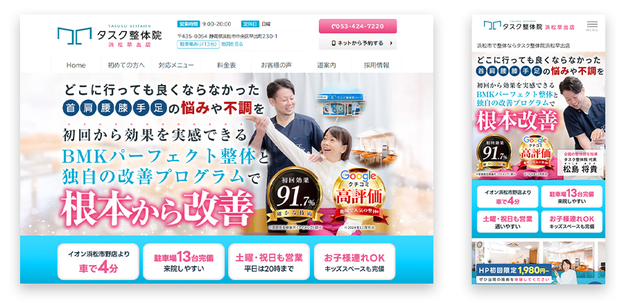 CLIENT タスク整体院 早出店 LINK https://tasuku-seitai.com/ ターゲット 女性 30~50代 カラー 青 プラン フルカスタマイズ 参照の同意 必要 デザインする上で心掛け... -